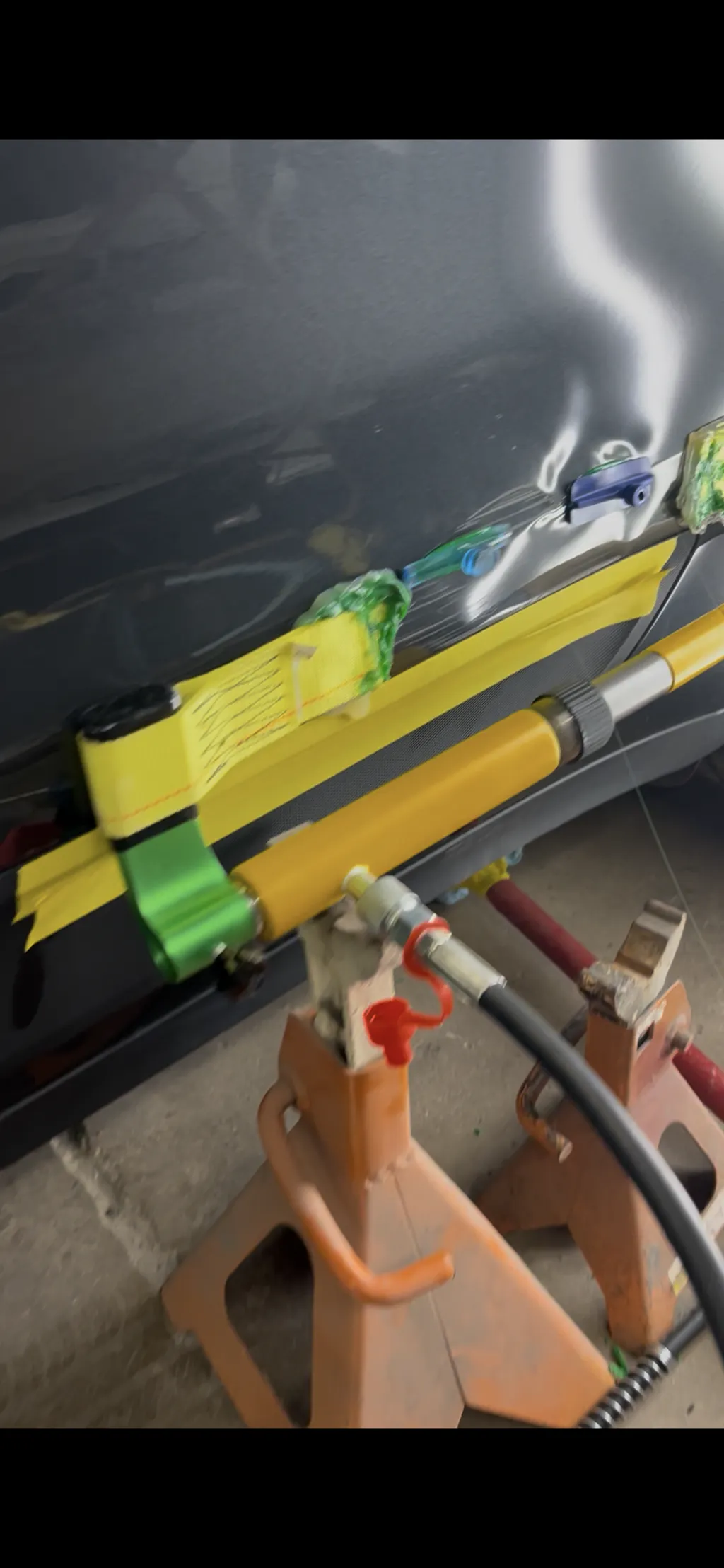 Use these amazing adapters to connect onto your porta power that you might have from Harbor freight or anywhere else! These adapters allow you to use hydraulic power and our green lateral tension straps and get the center of the extending bar out from the center of your Dent so that you can work the Dent while it’s under tension. The offset design also moves the Porter power down and away from the panel to keep the panel as safe as possible while still applying hundreds of pounds of hydraulic force